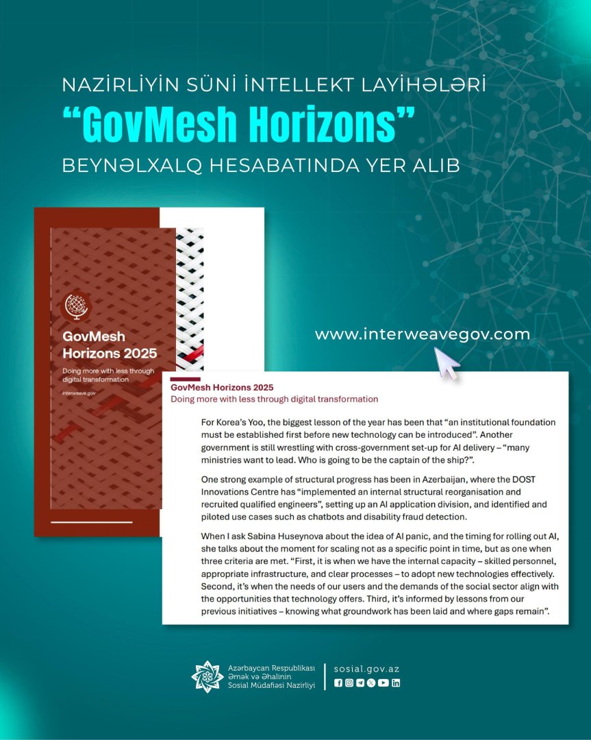 Sinqapurun “GovInsider” təşkilatı tərəfindən hazırlanmış “GovMesh Horizons” beynəlxalq hesabatında Azərbaycanın sosial sahədə rəqəmsal transformasiya və süni intellekt tətbiqləri üzrə təcrübəsi yer alıb.