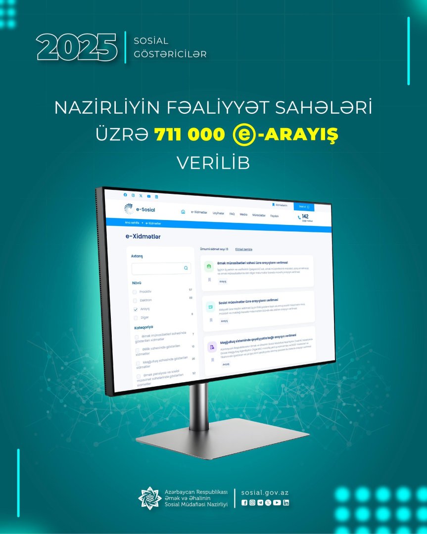 2025-ci ildə Əmək və Əhalinin Sosial Müdafiəsi Nazirliyinin fəaliyyət sahələri üzrə 711 min elektron arayış verilib.
