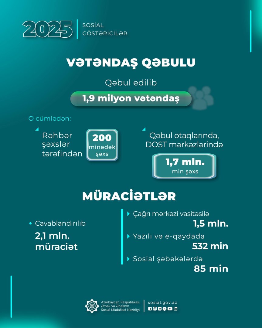 Məlumata görə, 2025-ci il ərzində Nazirliyə müxtəlif kanallar vasitəsilə daxil olan 2,1 milyon vətəndaş müraciəti də cavablandırılıb. Bu müraciətlərdən 532 mini yazılı və elektron qaydada, 85 mini sosial şəbəkələr üzərindən, 1,5 milyonu isə “142” Çağrı mərkəzi vasitəsilə daxil olub.