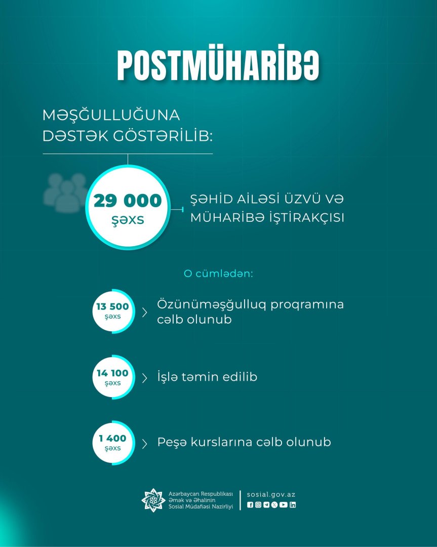 TurkicWorld Əmək və Əhalinin Sosial Müdafiəsi Nazirliyinə istinadən xəbər verir ki, Nazirliyin tabeliyində fəaliyyət göstərən Dövlət Məşğulluq Agentliyi tərəfindən postmüharibə dövründə şəhid ailəsi üzvü və müharibə iştirakçısı olan ümumilikdə 29 min şəxs müxtəlif məşğulluq tədbirləri ilə əhatə edilib.