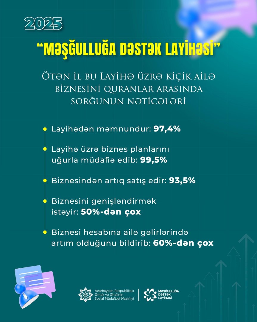 Sorğu 2025-ci ildə “Məşğulluğa Dəstək Layihəsi” çərçivəsində avadanlıqlarla təmin edilərək istehsal və xidmət sahələri üzrə kiçik bizneslərini qurmuş şəxsləri əhatə edib.