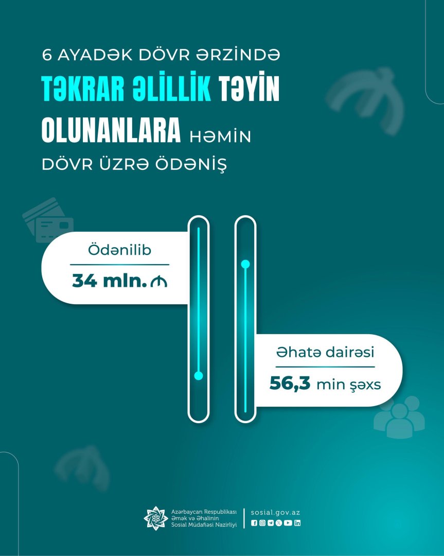 Onlara əvvəlki əlillik müddətinin bitdiyi vaxtdan təkrar əlillik təyin olunan vaxta qədərki dövr üzrə ümumilikdə 34 mln. manat vəsait ödənilib.