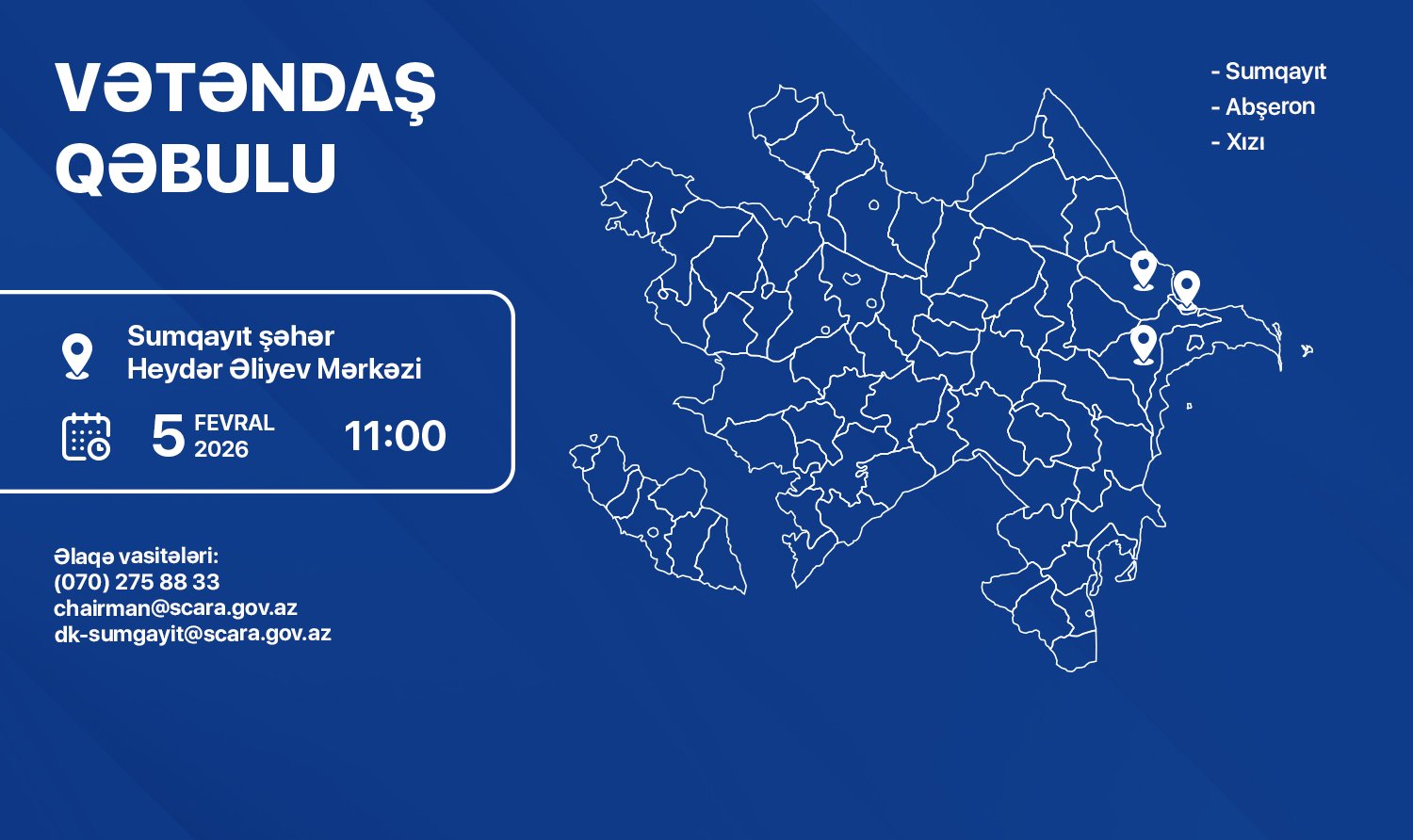 Qəbul saat 11:00-da Sumqayıt şəhər Heydər Əliyev Mərkəzində (ünvan: Sumqayıt şəhəri, Zülfü Hacıyev küçəsi, 53) keçiriləcək.