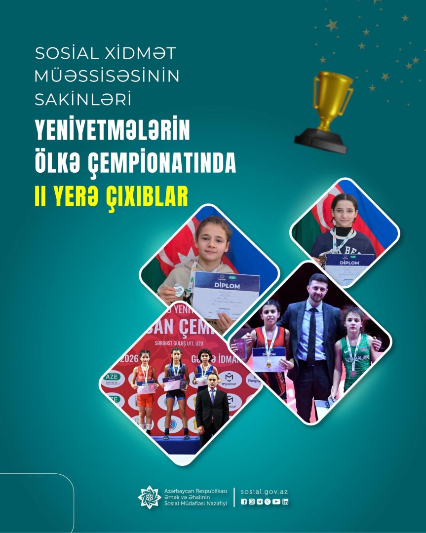 Əmək və Əhalinin Sosial Müdafiəsi Nazirliyinin tabeliyində Sosial Xidmətlər Agentliyinin 2 saylı Uşaq evi sosial xidmət müəssisəsinin sakinləri İradə Çeredelina və Sara Kərimova qadın güləşi üzrə yeniyetmələrin ölkə çempionatında II yerin qalibi olublar.