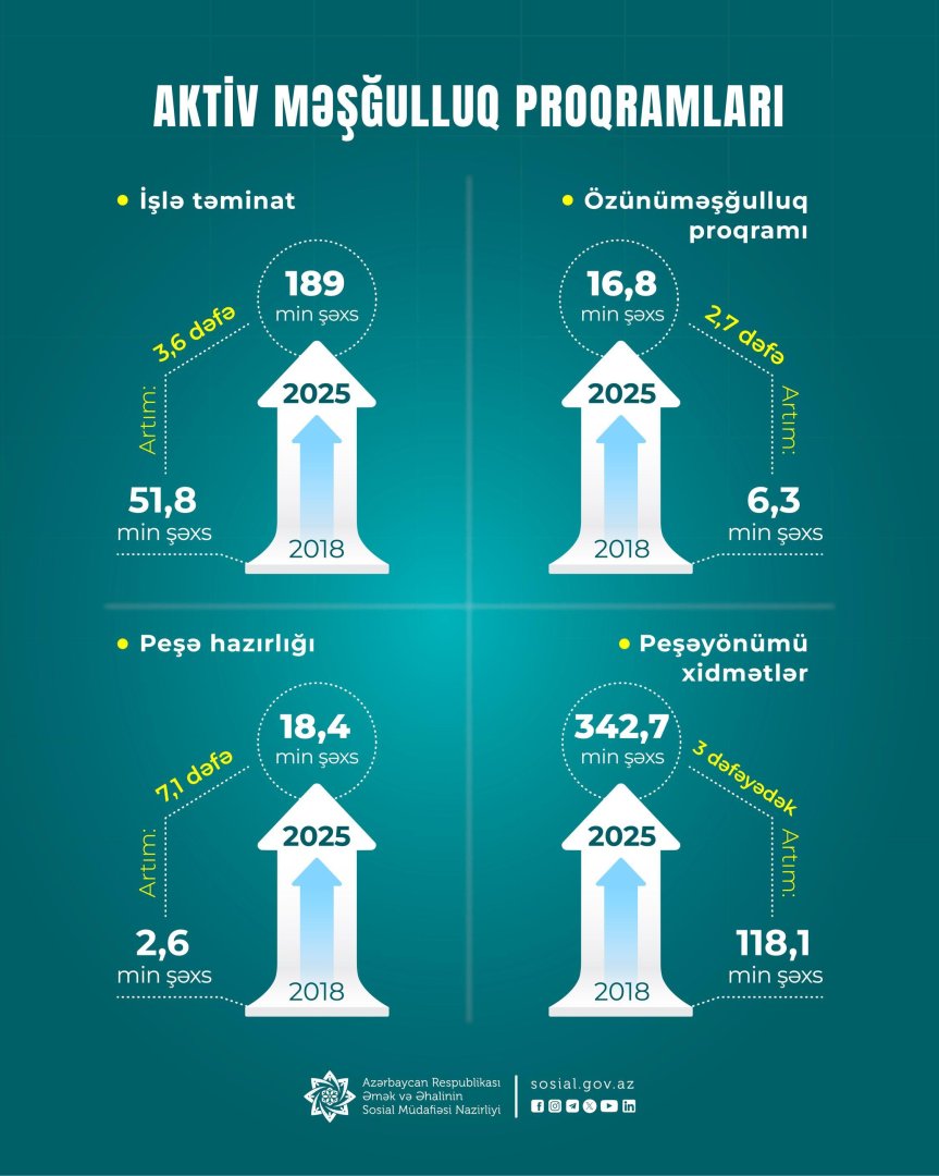 2018-ci ilə nisbətən 2025-ci ildə işlə təmin olunanların sayı 3,6 dəfə artaraq 189 min nəfər, özünüməşğulluq proqramına cəlb edilənlərin sayı 2,7 dəfə artaraq 16,8 min nəfər təşkil edib.