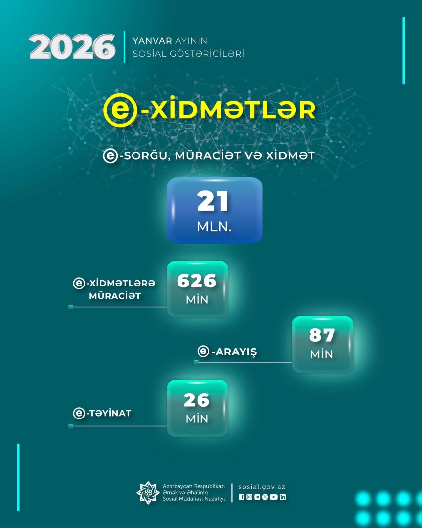 Əmək və Əhalinin Sosial Müdafiəsi Nazirliyinin fəaliyyət sahələri üzrə əhaliyə təqdim olunan elektron xidmətlərə 2026-cı ilin yanvar ayında 626 min müraciət edilib.