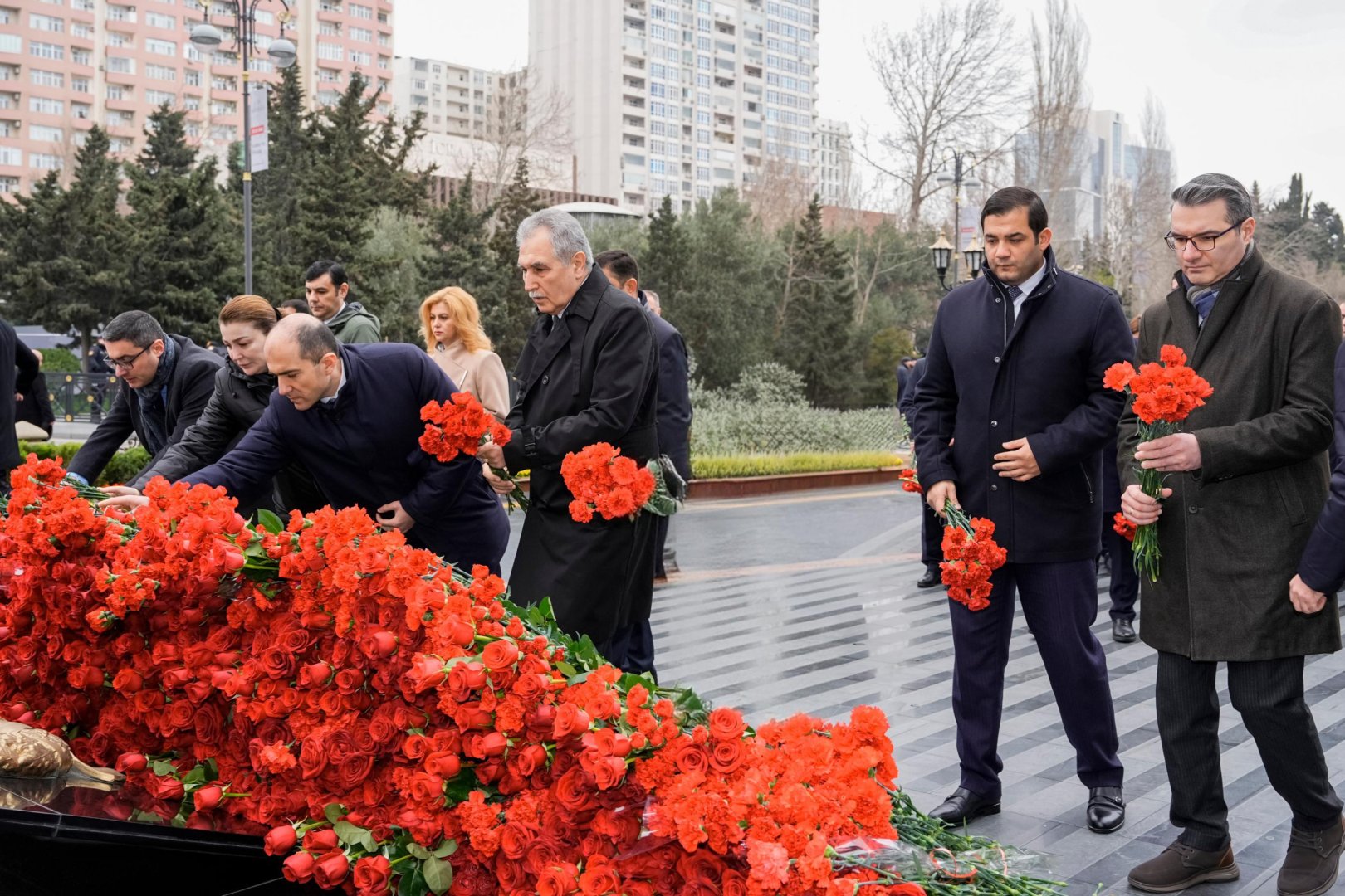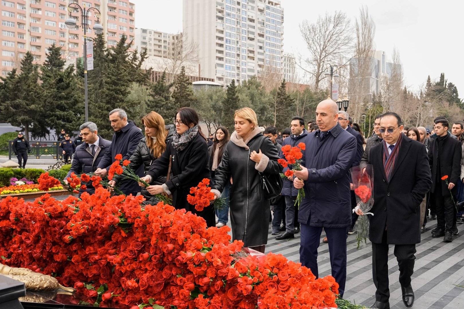 Abidənin önünə gül dəstələri düzülüb, Xocalı soyqırımı qurbanlarının əziz xatirəsi dərin ehtiramla yad olunub.