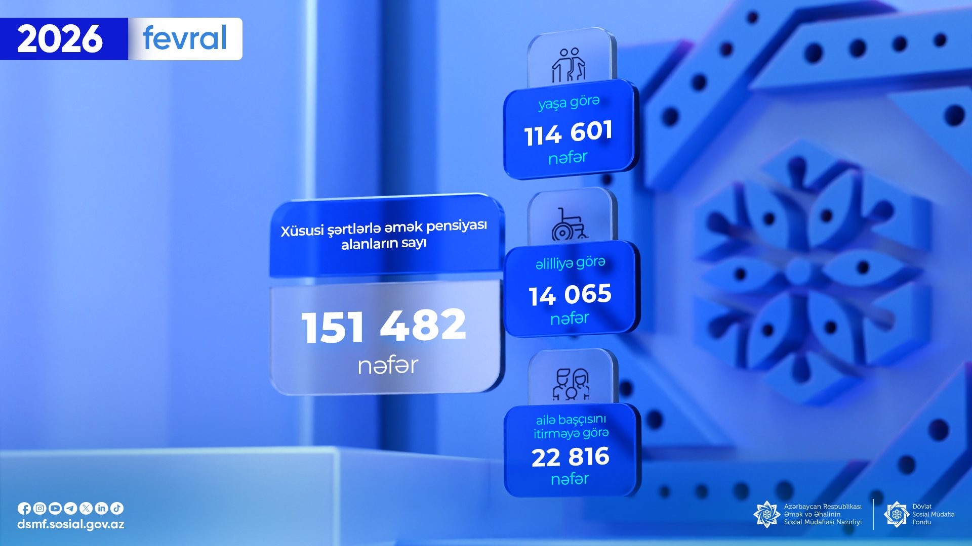 Fevral ayı ərzində xüsusi şərtlərlə əmək pensiyası alanların ümumi sayı 151 482 nəfər təşkil edib.