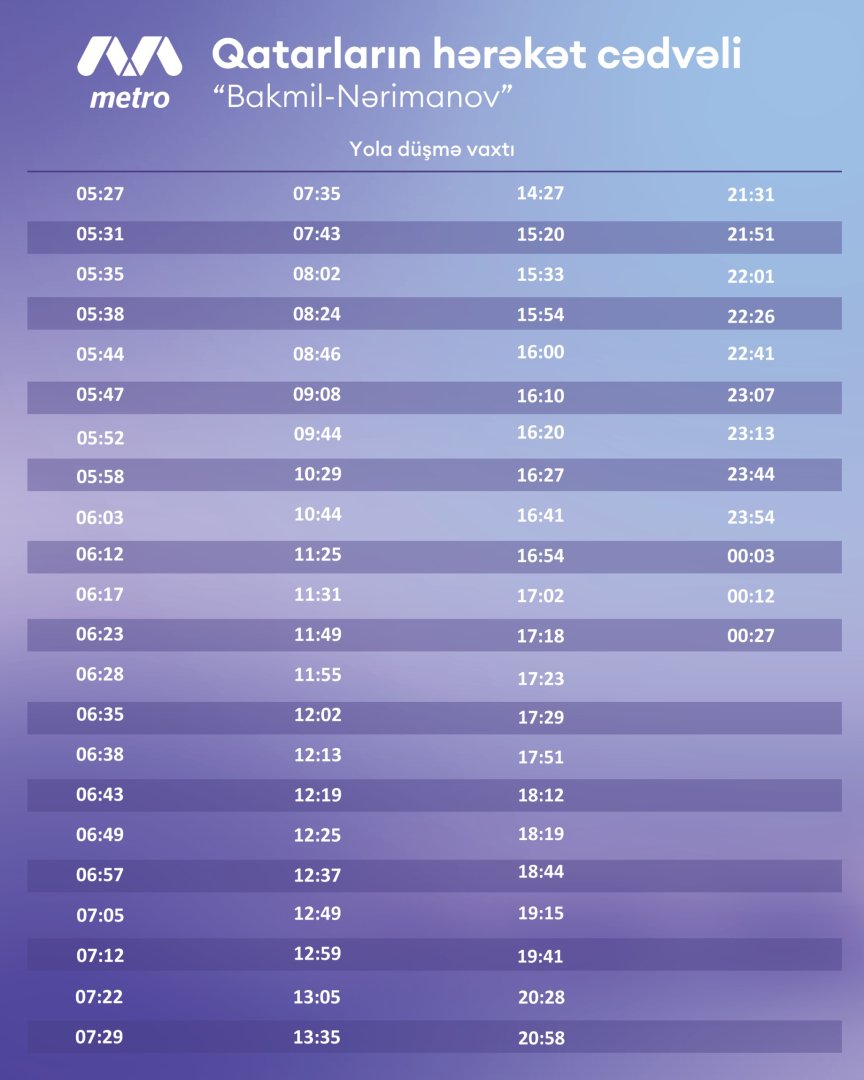 Metropoliten rəhbərliyi bildirir ki, sınaqların gedişi və qatarların dəqiq hərəkət cədvəli barədə ictimaiyyətə mütəmadi olaraq əlavə məlumatlar veriləcək. Sərnişinlərdən martın 4-dən etibarən mənzil başına vaxtında çatmaq üçün yenilənmiş qrafiki nəzərə almaları xahiş olunur.