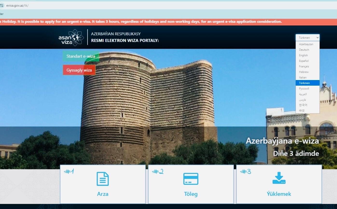 Hazırda Türkmənistan vətəndaşları “ASAN Viza” portalına https://www.evisa.gov.az/tk/ linki vasitəsilə daxil olaraq elektron viza müraciətlərini digər dillərlə yanaşı, türkmən dilində də edə bilərlər.