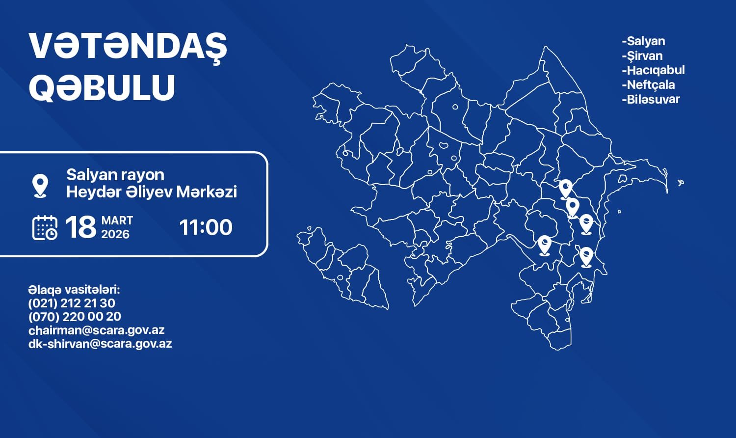 Qəbul saat 11:00-da Salyan rayon Heydər Əliyev Mərkəzində (ünvan: Salyan şəhəri, T.Xəlilbəyli küçəsi, 136) keçiriləcək.