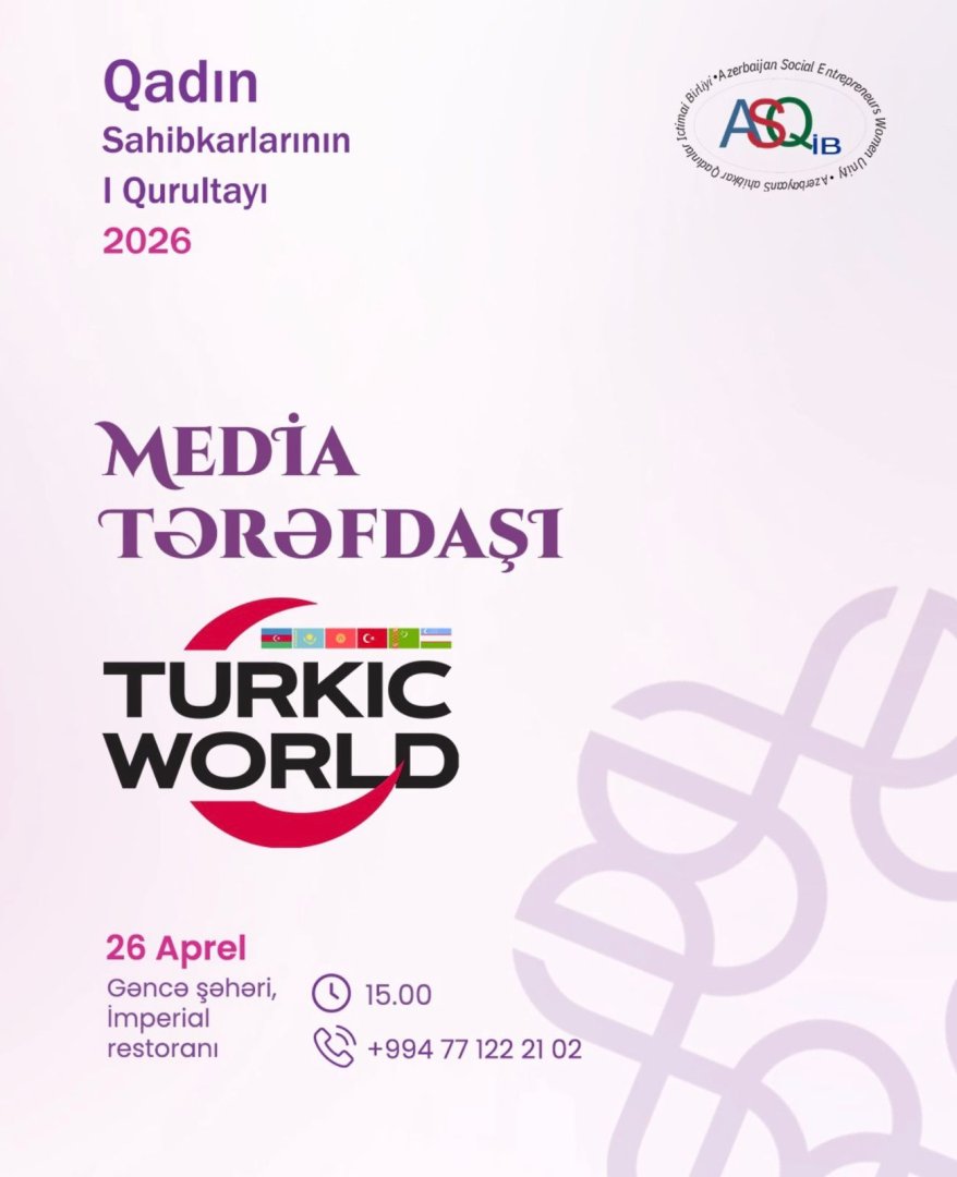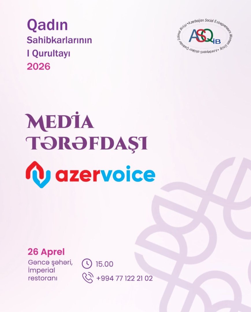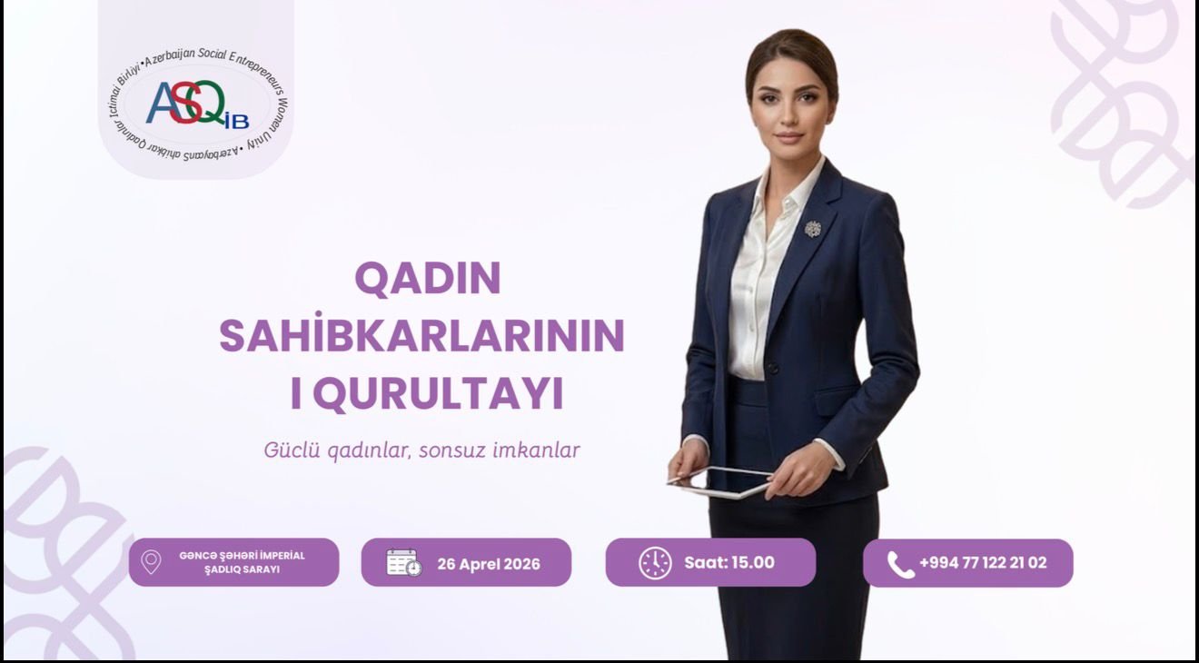Azərbaycan Sahibkar Qadınlar İctimai Birliyinin (ASQİB) təşkilatçılığı ilə 26 aprel 2026-cı il tarixində, saat 15:00-da Gəncə şəhərində yerləşən "İmperial" restoranında Qadın Sahibkarlarının I Qurultayı baş tutacaq. "Güclü qadınlar, sonsuz imkanlar" şüarı altında keçirilən bu möhtəşəm tədbir istehsal, xidmət və ticarət sahəsində uğur qazanan iş qadınlarını, qadın sahibkarlığına dəstək verən dövlət rəsmilərini, marketinq və hüquq üzrə tanınmış ekspertləri, eləcə də gələcəyin perspektivli gənc startapçılarını bir araya gətirəcək.