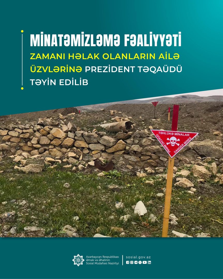 Azərbaycan Respublikası Prezidentinin 31 mart 2026-cı il tarixli Fərmanının icrası olaraq Əmək və Əhalinin Sosial Müdafiəsi Nazirliyi minatəmizləmə fəaliyyəti zamanı partlayıcı sursatların işə düşməsi nəticəsində baş verən bədbəxt hadisə ilə əlaqədar həlak olan minatəmizləyənlərin – Namazov Seymur Rəşid oğlu və İsayev Raqif Deputat oğlunun 4 nəfər ailə üzvlərinə Prezidentin aylıq təqaüdünü təyin edib.