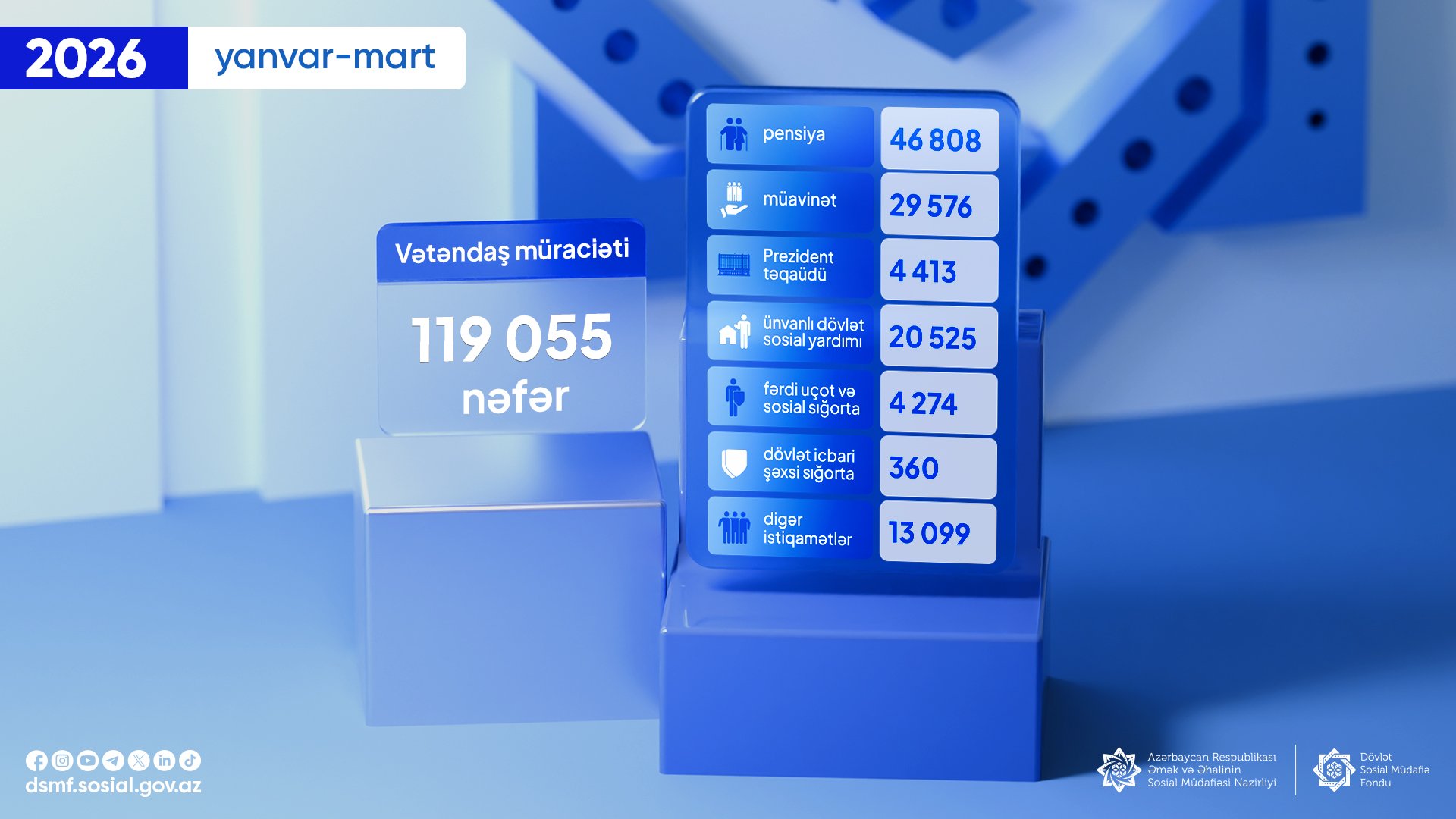2026-cı ilin yanvar-mart ayları ərzində Dövlət Sosial Müdafiə Fondunun fəaliyyət istiqamətləri üzrə ümumilikdə 119 055 vətəndaş müraciəti qeydə alınıb.