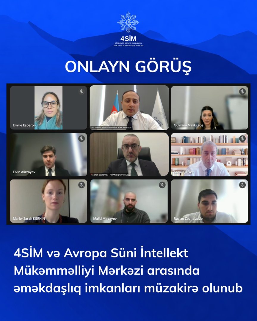 İqtisadiyyat Nazirliyinin tabeliyində Dördüncü Sənaye İnqilabının Təhlili və Koordinasiya Mərkəzinin (4SİM) icraçı direktoru Fariz Cəfərov Fransada fəaliyyətə başlayan Dünya İqtisadi Forumunun 4Sİ Mərkəzləri şəbəkəsinin üzvü olan Avropa Süni İntellekt Mükəmməlliyi Mərkəzinin (“European Centre for AI Excellence” - ECAIE) Əməliyyatlar üzrə baş direktoru Emili Esparon ilə onlayn formatda görüşüb.