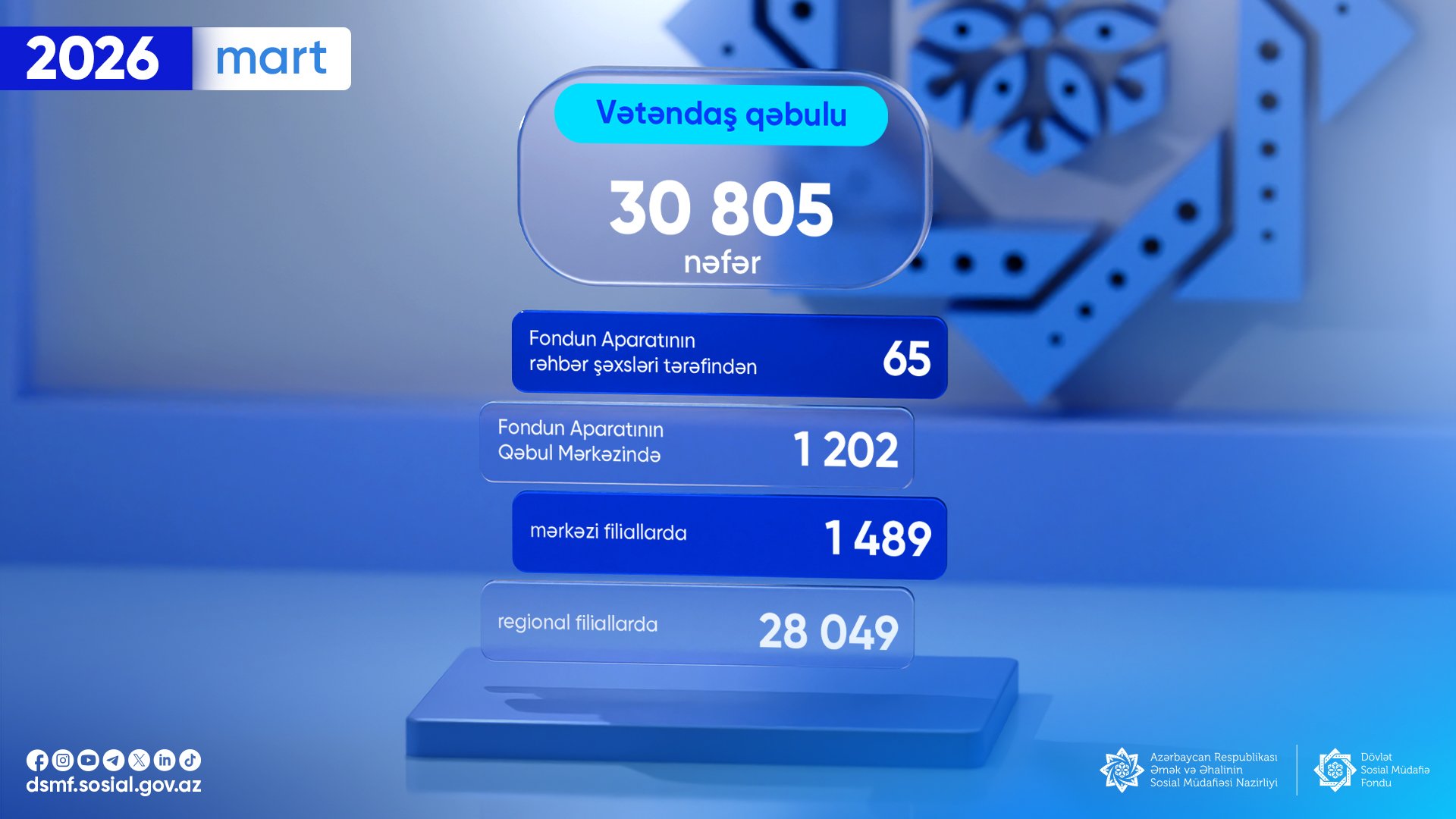 2026-cı ilin mart ayı ərzində Dövlət Sosial Müdafiə Fondunun fəaliyyət istiqamətləri üzrə ümumilikdə 30 805 vətəndaş qəbul edilib və onların müraciətləri cavablandırılıb.