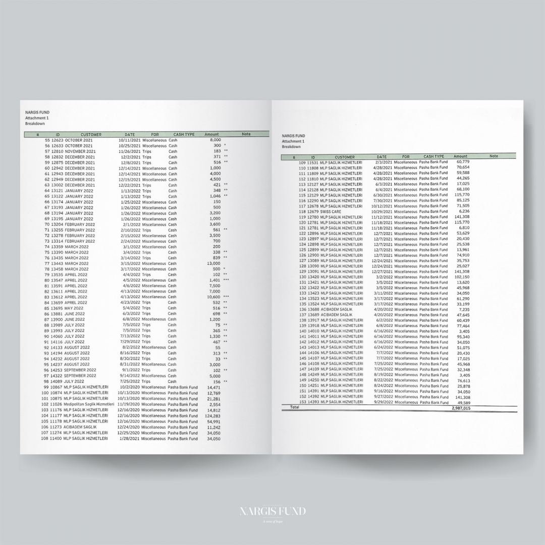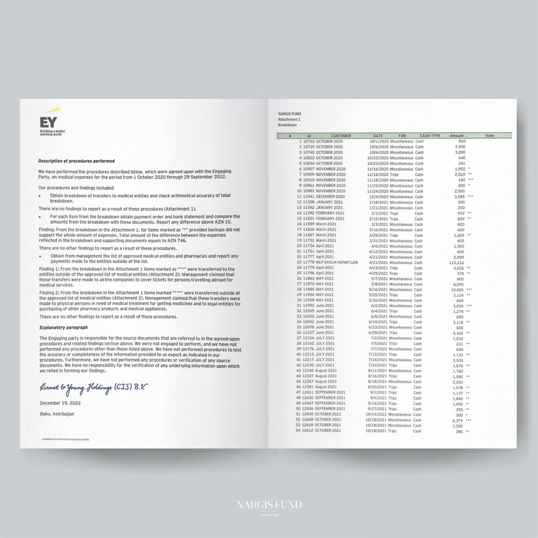 Dünyanın ən nəhəng dörd audit şirkətlərindən biri olan EY tərəfindən "Nargis" Fondunun 01 Oktyabr 2020-ci il tarixindən 29 Sentyabr 2022-ci il tarixinə qədər dövrü əhatə edən maliyyə hesabatlarının yoxlamaları həyata keçirilmişdir.
