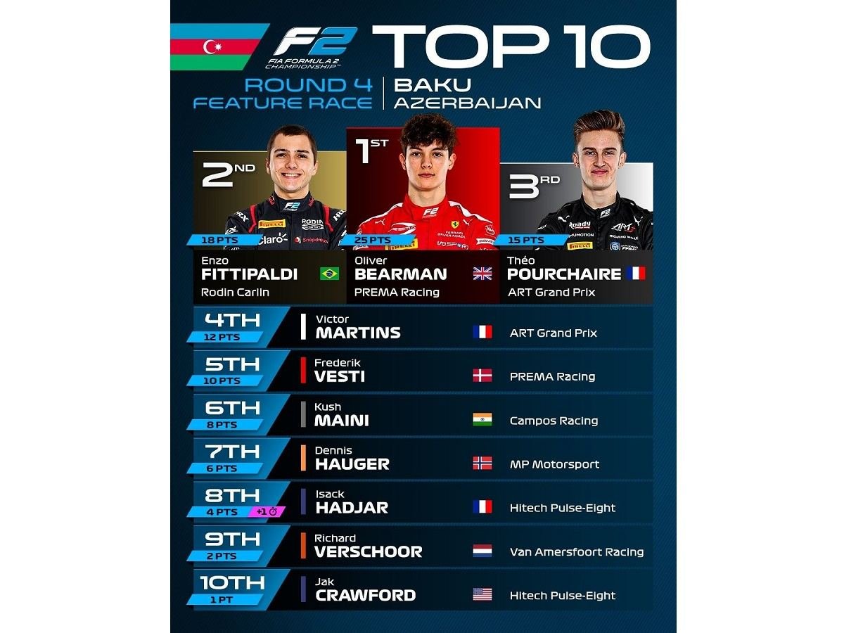 Formula 2 komandalarının birinci sprint yarışının qalibi isə "Prema Racing"dən Oliver Bearman qalib olub.