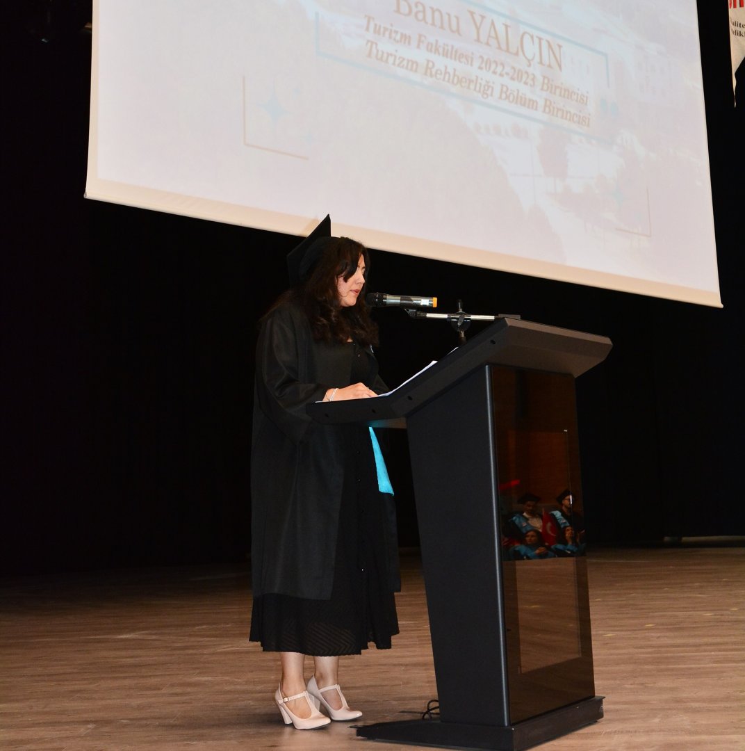 Mərasimdə Turizm fakültəsinin dekan müavini prof. Dr. Nuray Tetik Dinç, çıxışı ilə tələbələri məzun olmaları münasibətilə təbrik edib.