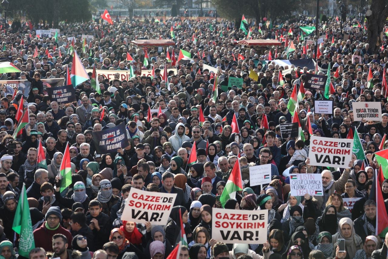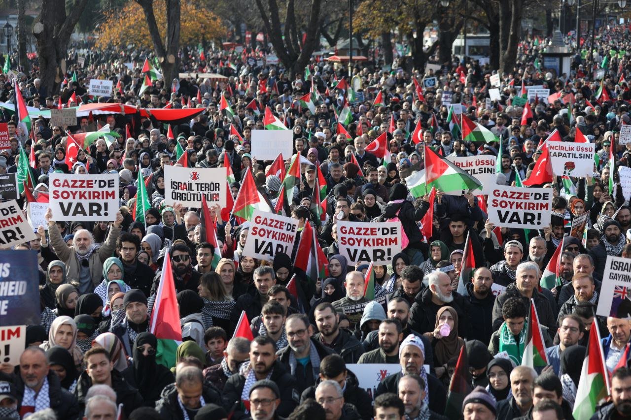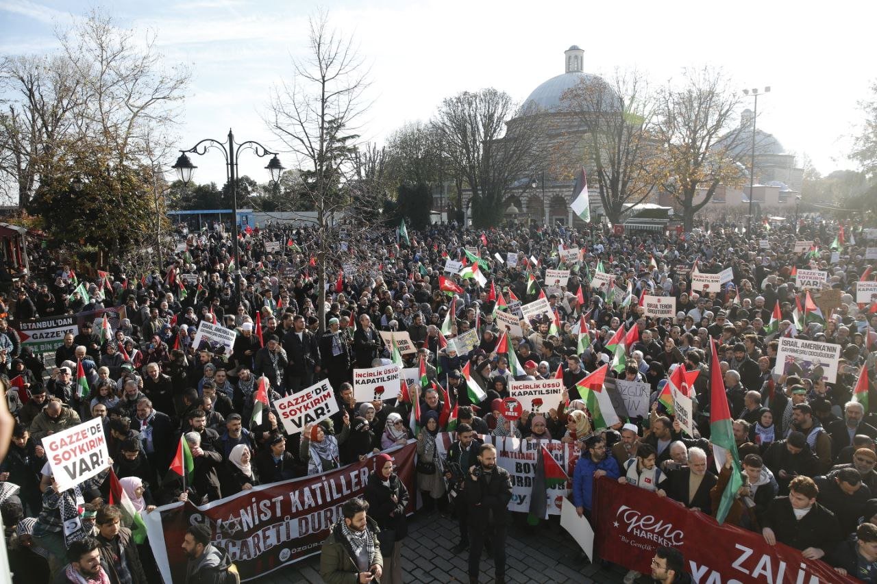 Məlumata əsasən, Bəyazid meydanından Ayasofya məscidi meydanına gedən iştirakçılar yürüş boyu “Qatil İsrail, Fələstindən çıx", Fələstin xalqı tək deyil” kimi şüarlar səsləndirib.