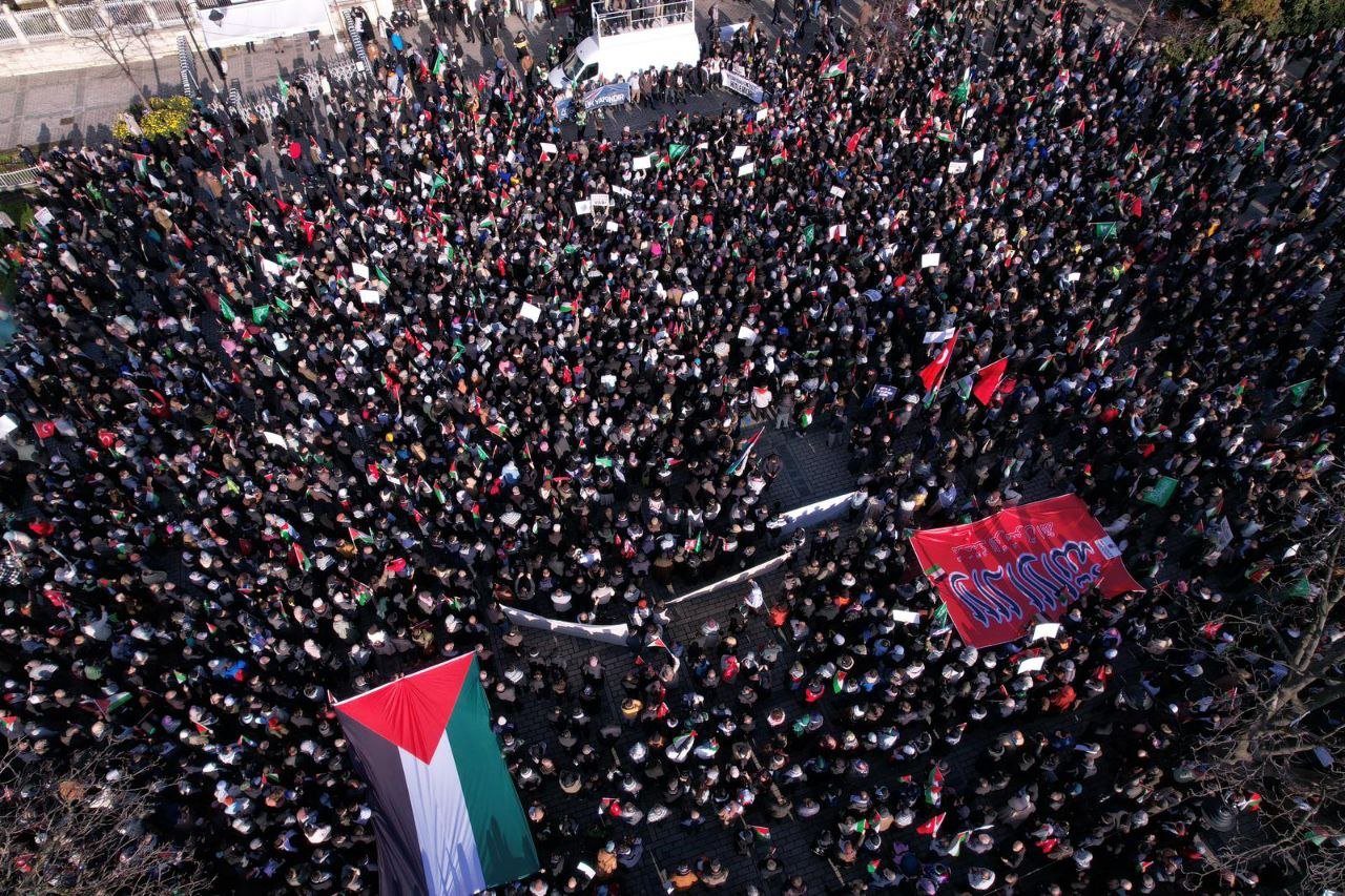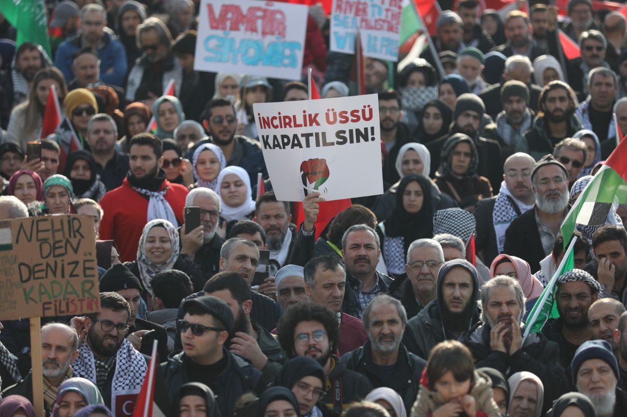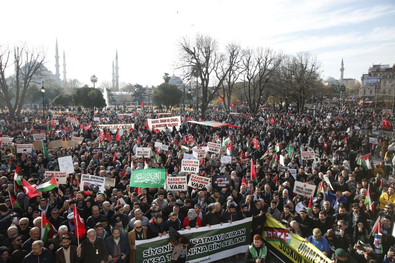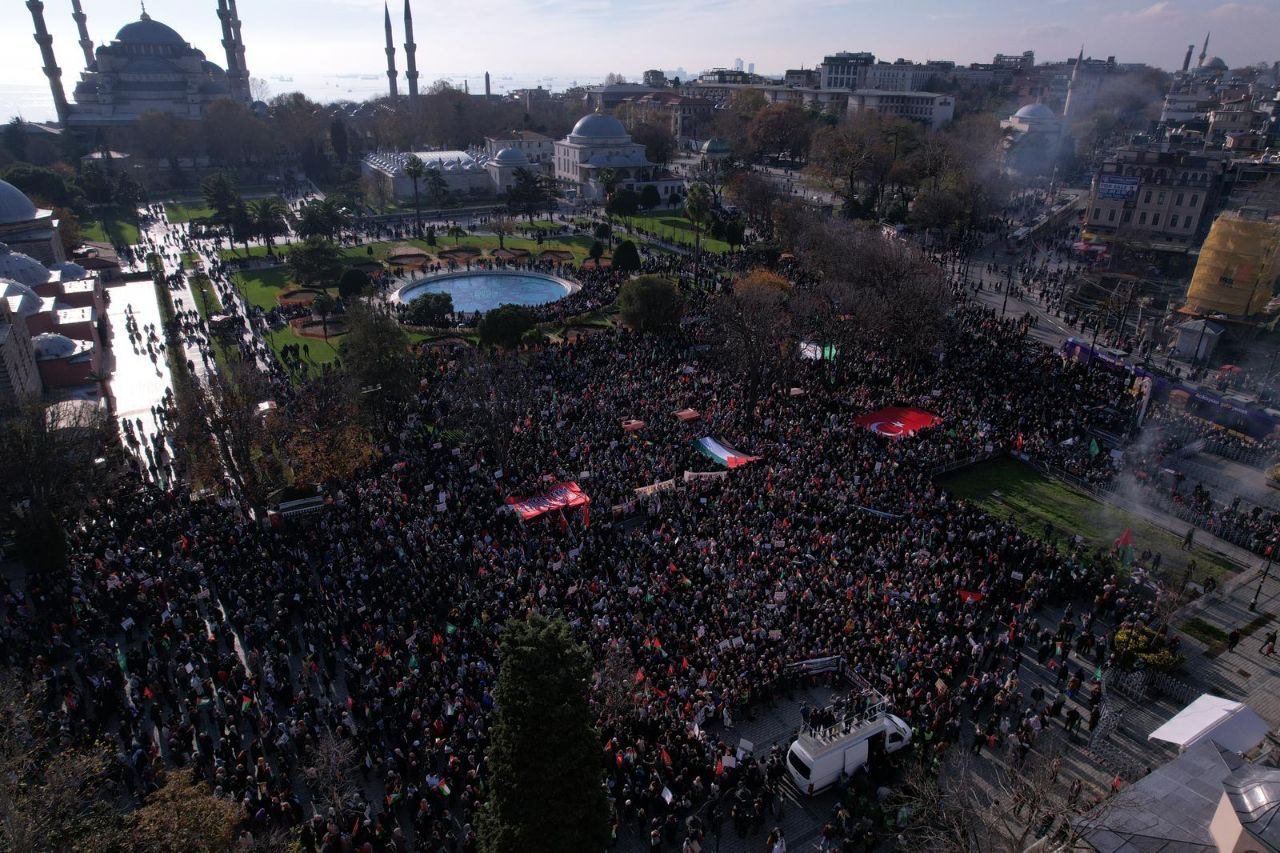Məlumata əsasən, Bəyazid meydanından Ayasofya məscidi meydanına gedən iştirakçılar yürüş boyu “Qatil İsrail, Fələstindən çıx", Fələstin xalqı tək deyil” kimi şüarlar səsləndirib.