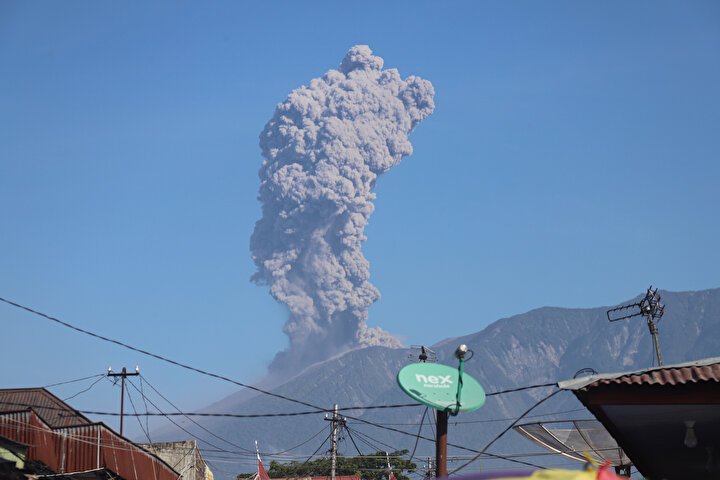 Tanah Datar bölgəsində qeydə alınan püskürmə zamanı dağdan qalxan kül sütunu səmada aydın müşahidə olunub.