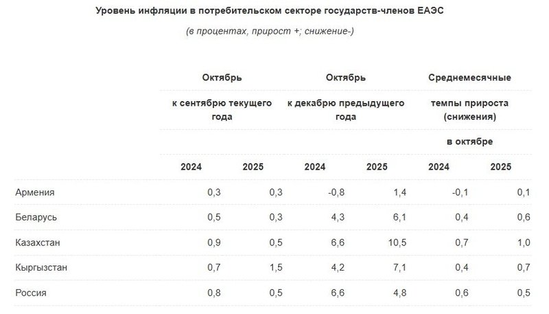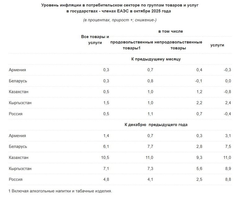 Among the EAEU countries, Kazakhstan has recorded the highest inflation rate since the beginning of the year. Compared to December 2024, consumer prices in the neighboring republic increased by 10.5% in October 2025. This was due to 11.0% increase in the cost of food products, a 9.3% increase in non-food prices, and an 11.0% increase in tariffs for services.