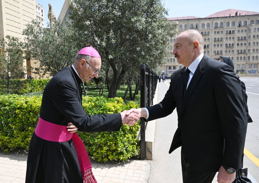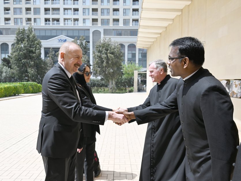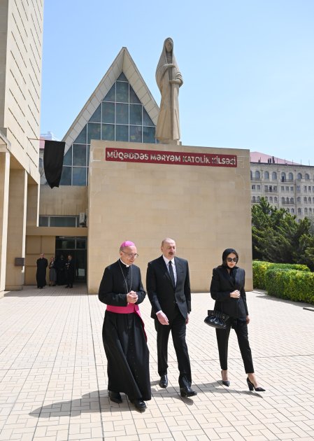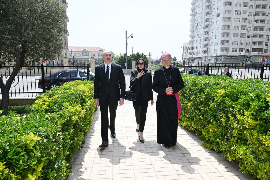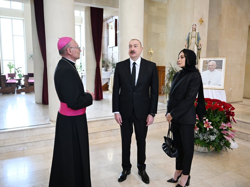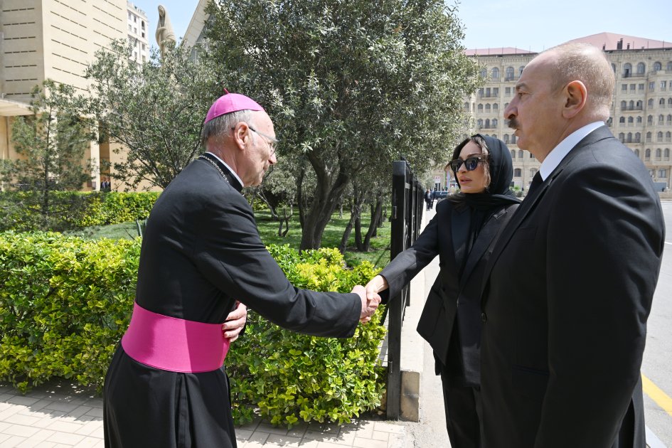 The head of state and the First Lady were welcomed by Bishop Vladimir Fekete, the Apostolic Prefect of the Catholic Church in Azerbaijan.