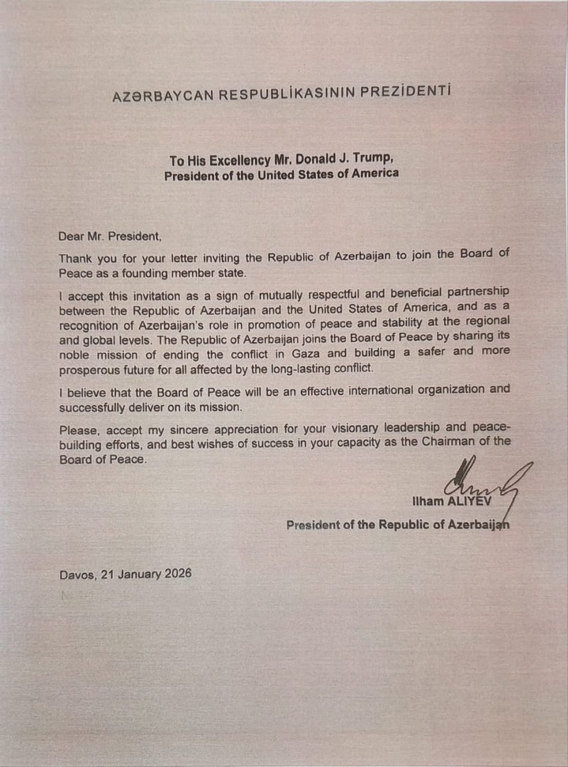 I accept this invitation as a sign of mutually respectful and beneficial partnership between the Republic of Azerbaijan and the United States of America, and as a recognition of Azerbaijan's role in promotion of peace and stability at the regional and global levels. The Republic of Azerbaijan joins the Board of Peace by sharing its noble mission of ending the conflict in Gaza and building a safer and more prosperous future for all affected by the long-lasting conflict.