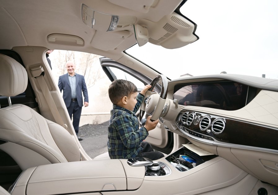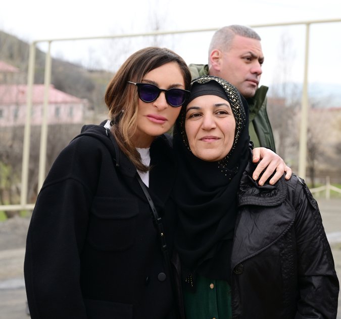The head of state and the First Lady then visited the home of Beybala Gasimov, a resident who recently returned to the village.