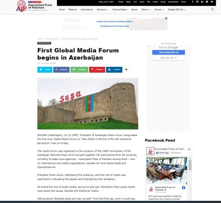 Pakistan's government agency, the Associated Press of Pakistan, published the main points of the speech of Azerbaijani President Ilham Aliyev. The agency's article reports that 150 foreign guests from 49 countries, including representatives of state news agencies from 34 countries, 12 international organizations and media structures, as well as 60 leaders and representatives of local media, are taking part in the forum, held in connection with the 148th anniversary of the national press of Azerbaijan.