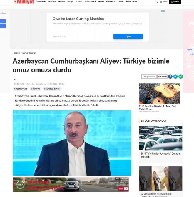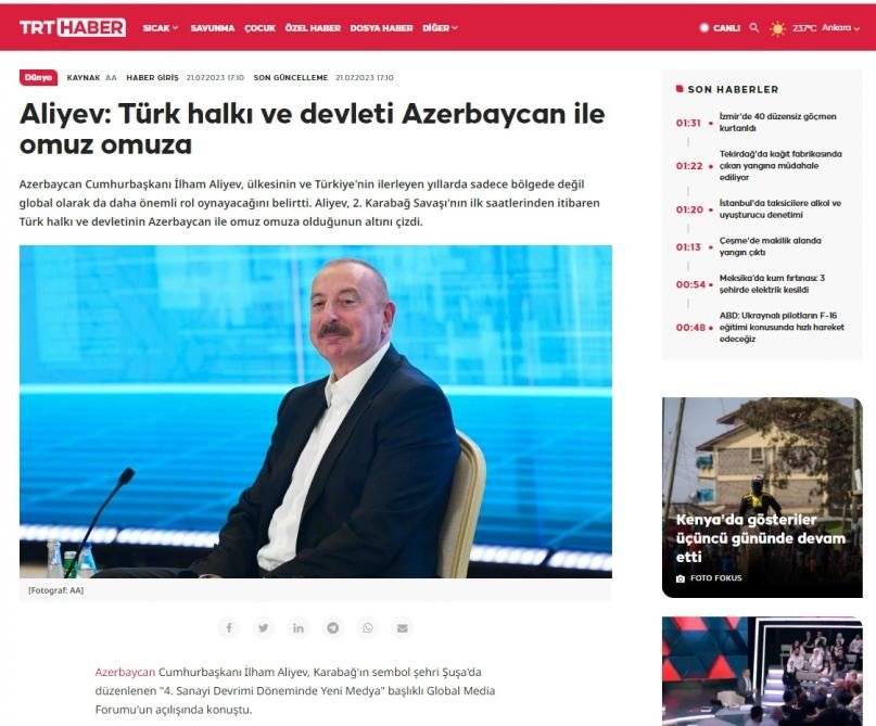 The speech of President Ilham Aliyev at the Shusha Global Media Forum was widely covered by the Turkish media. TRTHaber, Takvim, Yeni afak, HaberGlobal, Milliyet, Anadolu, and other TV channels, news agencies, newspapers, and news portals of Türkiye paid special attention to the words of the head of country about relations with Türkiye, who, in particular, said: "From the first days, even I would say, from the first hours of the Second Karabakh War, Türkiye, its people, and its leader were side by side with us. The statement of President Erdogan in the first hours of the Second Karabakh War that "Azerbaijan is not alone" was a great moral support to us."