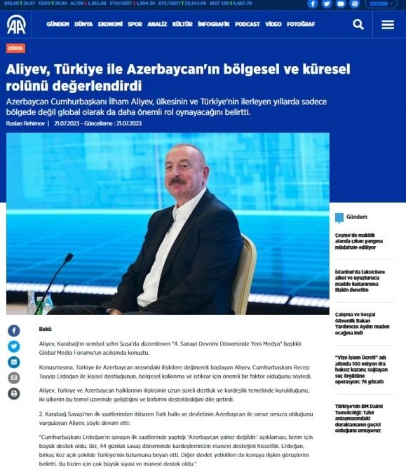 BAKU, Azerbaijan, July 22. The speech of Azerbaijani President Ilham Aliyev at the Shusha Global Media Forum on "New Media in the Era of the 4th Industrial Revolution" is in the spotlight of the world media, TurkicWorld reports.