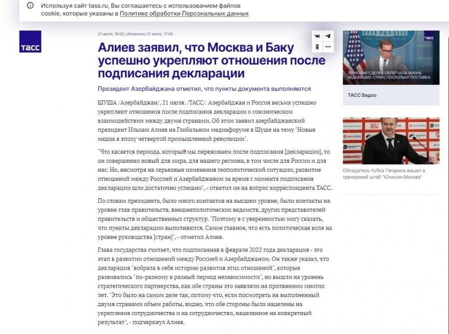 Moreover, the article also contains statements from the speech of Azerbaijani President Ilham Aliyev on Russian-Azerbaijani relations. According to the Belarusian edition, the head of the country said that relations with Moscow are at the level of strategic partnership.