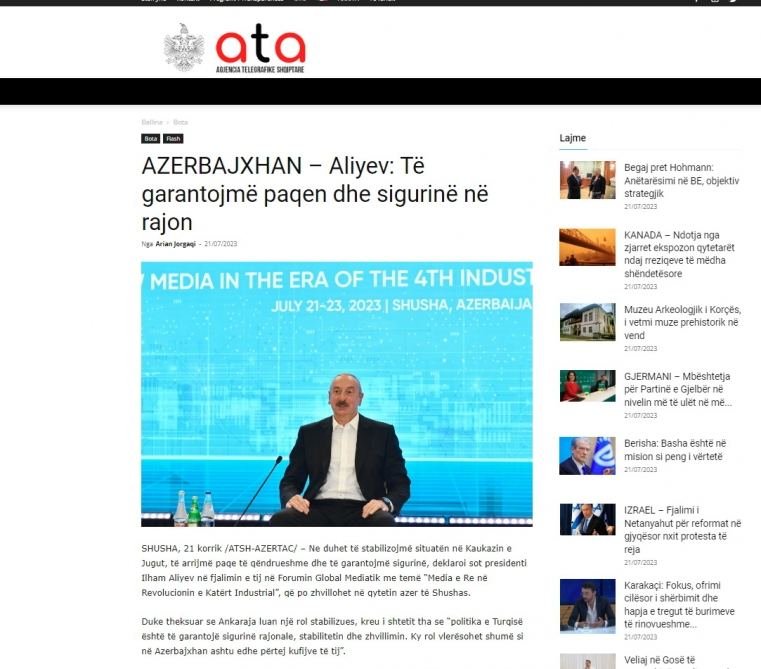 The article published by the Albanian Telegraph Agency (ATA) notes that at the Shusha Global Media Forum, Azerbaijani President Ilham Aliyev touched upon important global and regional issues. The foreign media drew the audience's attention to the Azerbaijani President's remarks on such topics as Turkey's support for Azerbaijan in the Second Karabakh War, Baku's relations with Moscow, Azerbaijan's successful chairmanship in the Non-Aligned Movement, new realities in the region after Azerbaijan's victory in the Patriotic War, Armenia's mine terror against Azerbaijan, as well as the peace process.