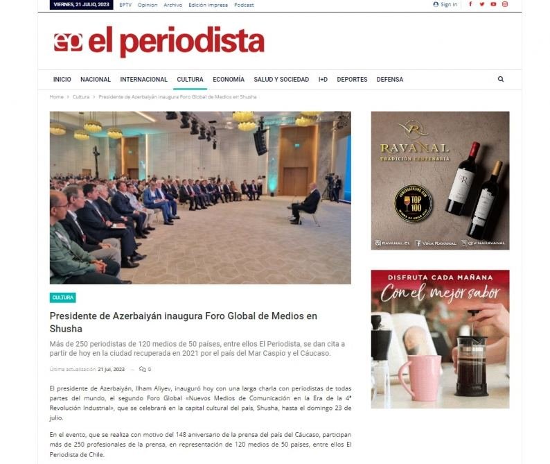 Moreover, Spain's "El Periodista" published the main thesis of the speech of Azerbaijani President Ilham Aliyev at the Shusha Global Media Forum. The article reflects the statements and opinions of the head of state about the new realities in the South Caucasus region and in the world, the situation in Karabakh at present, the Armenian minority living in this region, the work on demining the territories liberated from occupation, as well as the return of Azerbaijanis to their lands.