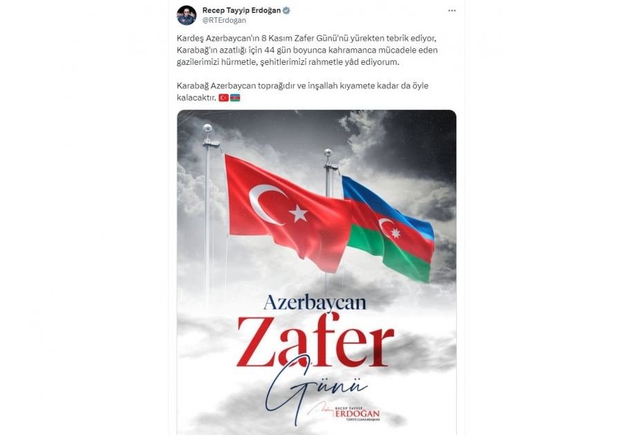 BAKU, Azerbaijan, November 8. Turkish President Recep Tayyip Erdogan has shared a publication on the occasion of November 8 - Victory Day of Azerbaijan, TurkicWorld reports.