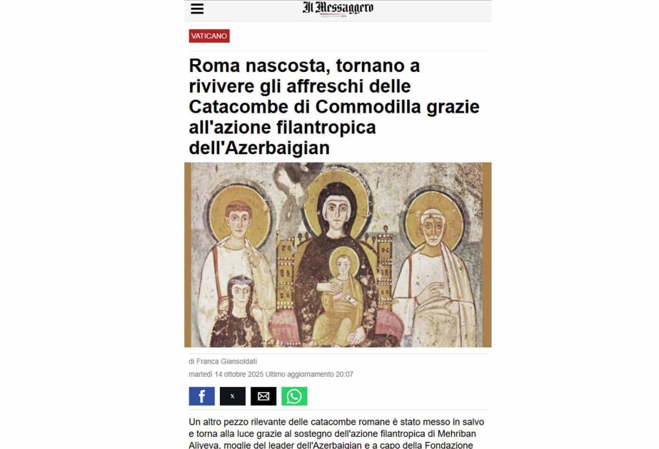 BAKU, Azerbaijan, October 16. An influential Italian newspaper "il Messaggero" published an article headlined "Secret Rome, thanks to the charitable activities of Azerbaijan, the frescoes of the Catacombs of Commodilla renewed."
