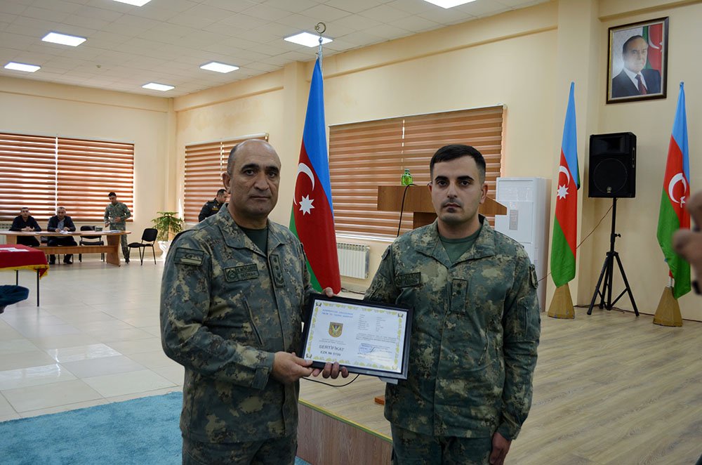 Then certificates were presented to the graduates, and the top graduate, Lieutenant Rahida Shahverdiyeva, affixed a graduation emblem to a symbolic stump.