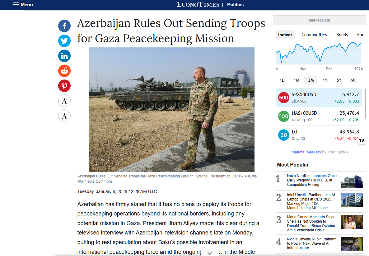 "Regarding the possibility of participating in actions in the Middle East, we were surprised by the statement of the US Ambassador to the UN, who claimed that Azerbaijan had given its consent. We did not give our consent, and we informed the US administration through diplomatic channels that such false statements are unacceptable and create a false impression. Perhaps there was an attempt to lure others into the process by saying Azerbaijan had agreed; I do not rule that out, but if so, it is absolutely unacceptable. We compiled a questionnaire of more than 20 questions and submitted it to the American side. Until these questions are clarified, no participation by Azerbaijan in any mission is envisioned," the president said.