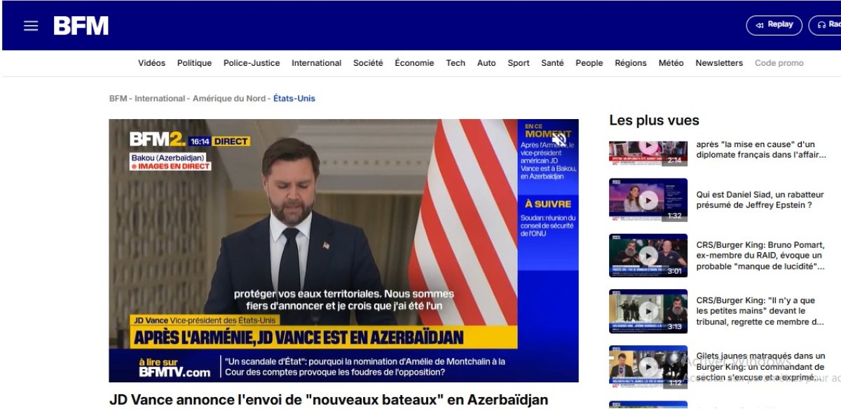 French media outlets including France, Mediapart, BFM TV, Challenges, L’Humanité, Boursorama and Boursier published articles highlighting Vice President JD Vance’s visit to Azerbaijan, his talks with President Ilham Aliyev, the signing ceremony of the Charter on Strategic Partnership between the Government of the Republic of Azerbaijan and the Government of the United States of America, as well as the press statements delivered by both sides.