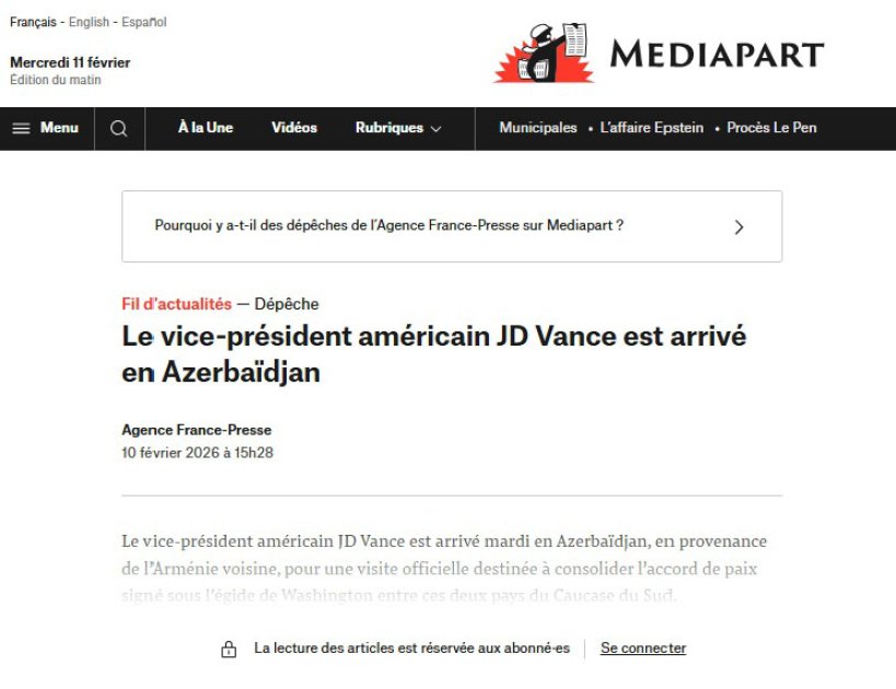 BAKU, Azerbaijan, February 11. French news portals, television channels and radio stations have widely covered the visit of U.S. Vice President JD Vance to Baku and his meeting with President of Azerbaijan Ilham Aliyev, TurkicWorld reports.