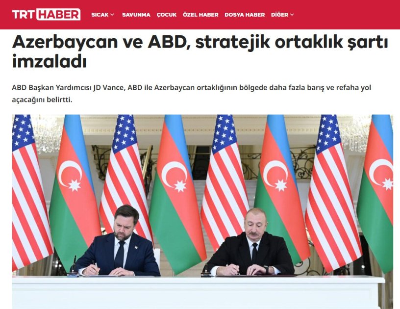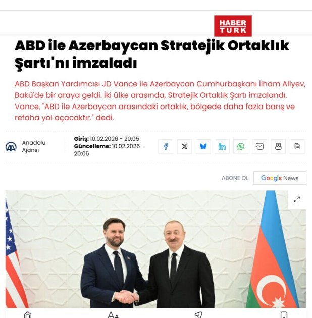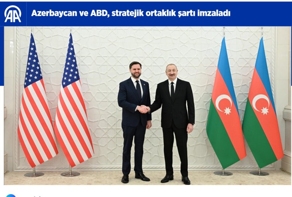 BAKU, Azerbaijan, February 11. Leading media outlets of Türkiye and the Turkish Republic of Northern Cyprus (TRNC), including major news agencies, newspapers, news portals, and TV channels have extensively covered the outcomes of the talks held in Baku between President of Azerbaijan Ilham Aliyev and U.S. Vice President JD Vance, TurkicWorld reports.