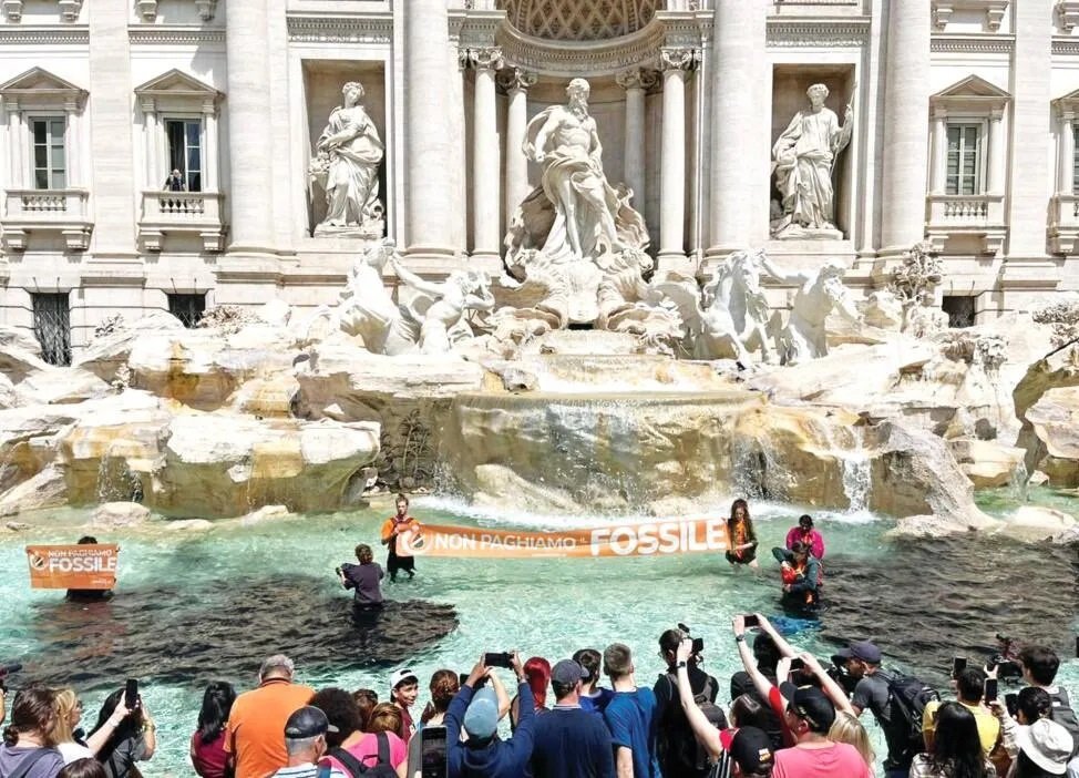 Activists from the anti-climate change organization Last Generation climbed into the landmark fountain and poured a vegetable-based carbon liquid into it, before being pulled out and escorted away by police.