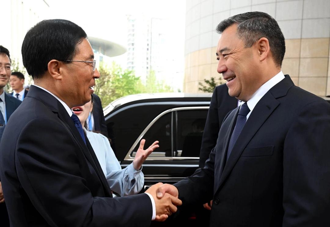 Садыр Жапаров Кытайдын борборуна ылдам жүрүччү поезд менен келди. Темир жол бекетинин аянчасына килем төшөлүп, тосуп алуучулар жана Кыргызстан менен Китайдын желектерин кармаган балдар катарга тизилишкен.