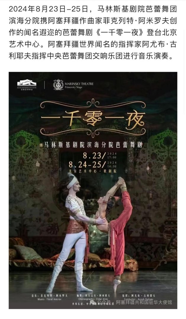 БАКУ / TurkicWorld/ - Балет выдающегося азербайджанского композитора, кавалера государственных премий и орденов, народного артиста СССР и Азербайджана Фикрета Амирова "Тысяча и одна ночь" с большим успехом был показан с 23 по 25 августа в Пекине, сообщили TurkicWorld в пресс-службе министерства культуры Азербайджана.