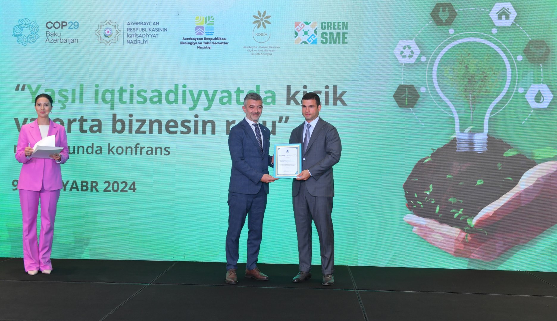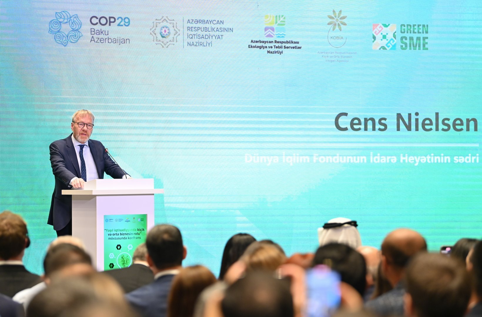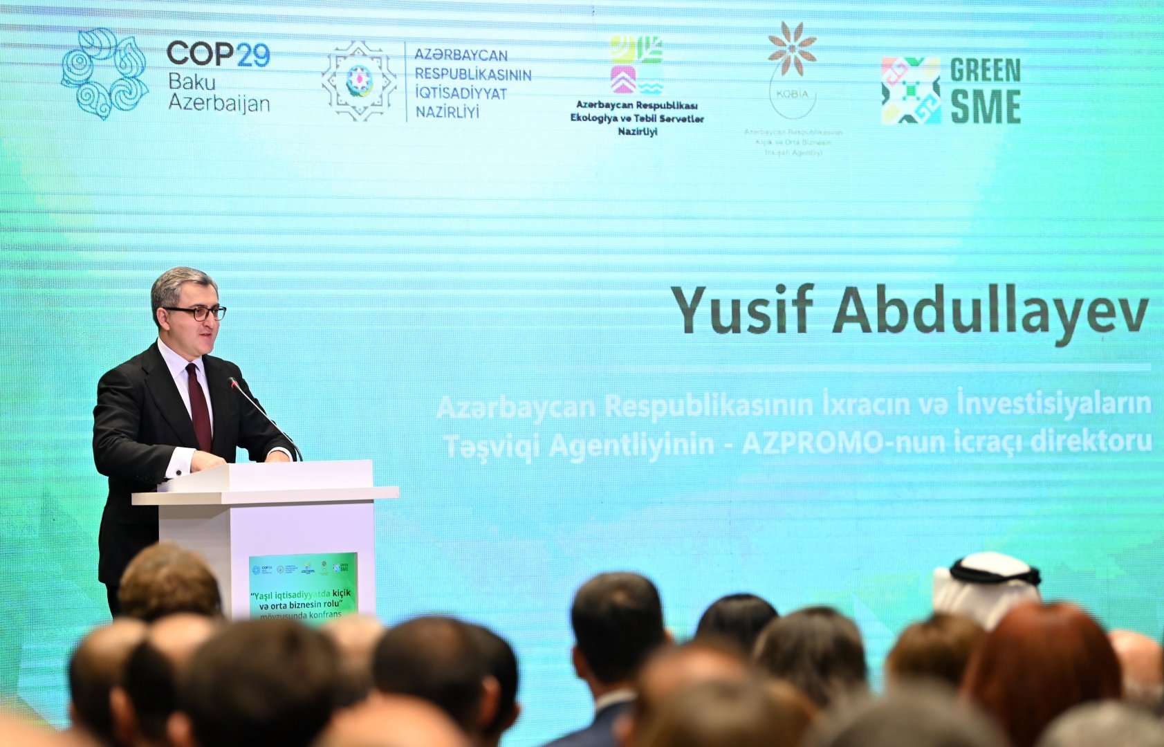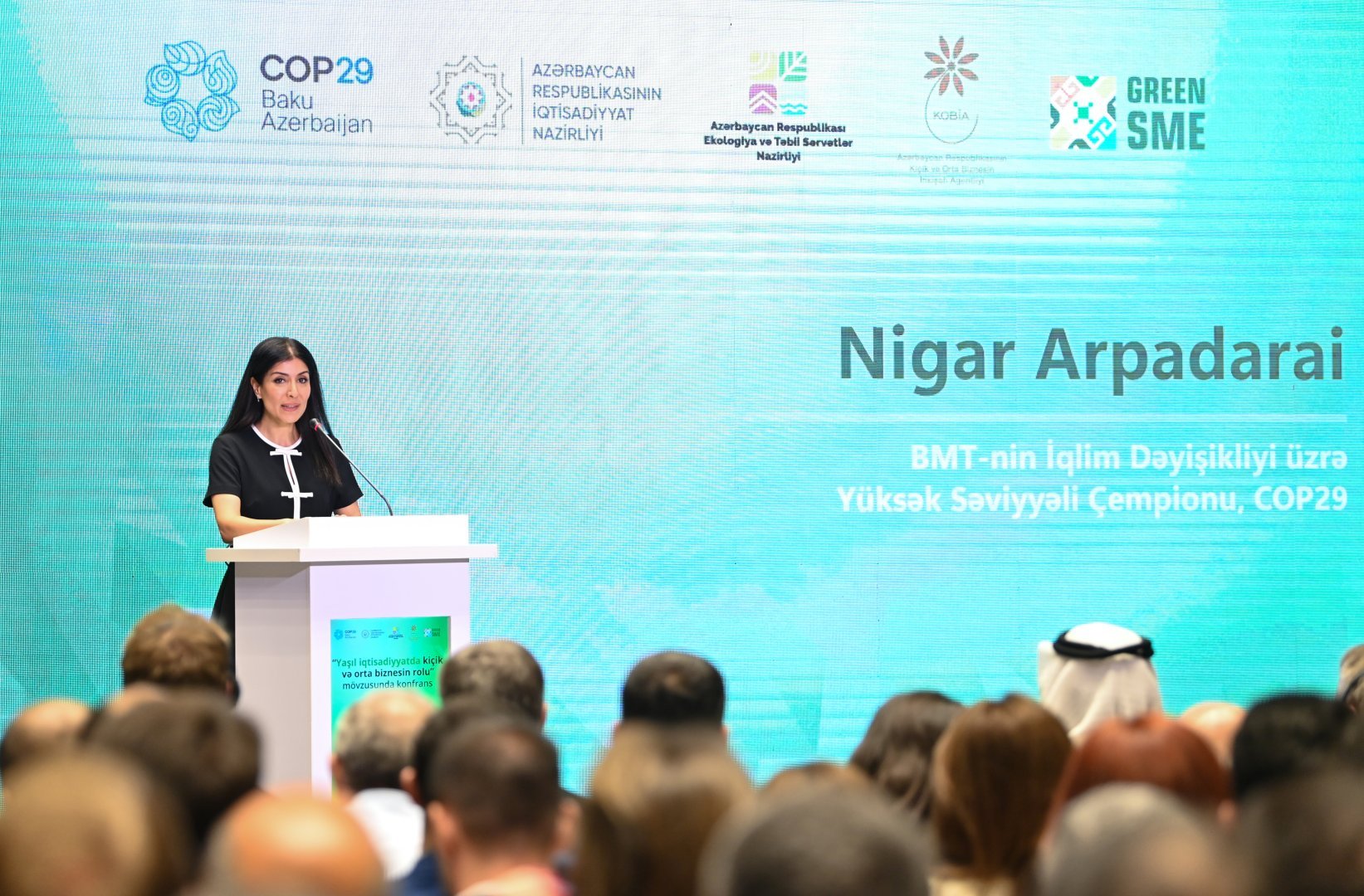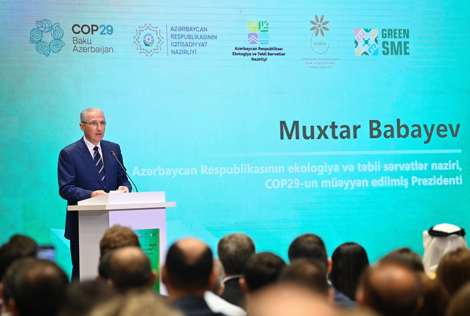 Выступившие на мероприятии министр экономики Микаил Джаббаров и министр экологии и природных ресурсов, назначенный президент COP29 Мухтар Бабаев, рассказали о роли "зеленой экономики" в устойчивом развитии, проводимых мероприятиях в рамках определенных Президентом Ильхамом Алиевым Национальных приоритетов "Чистая окружающая среда" и "Страна зеленого роста", внедрении экологически чистых технологий и предстоящих задачах по увеличению "зеленого" производства, вторичной переработке и содействию восстановлению загрязненных территорий. Было отмечено возрастающее значение и роль субъектов МСБ в социально-экономическом развитии Азербайджана. МСБ вносит значительный вклад в рост ВВП, занятость и экономическую реинтеграцию освобожденных территорий. МСБ должны заявить о себе в развитии "зеленой экономики" в новую эпоху. В этом направлении от МСБ ожидаются применение энергосберегающих технологий, достижение энергоэффективности за счет использования возобновляемых источников энергии, утилизация отходов, сокращение количества отходов и использование экологически чистых материалов, активное участие частного сектора в социальных проектах, производство экологически чистых продуктов и услуг и др. На конференции также выступили лидер высокого уровня ООН по климату Нигяр Арпадараи, председатель правления KOBİA Орхан Мамедов, исполнительный директор Агентства поощрения экспорта и инвестиций (AZPROMO) Юсиф Абдуллаев и председатель совета правления Всемирного фонда климата Дженс Нильсен.