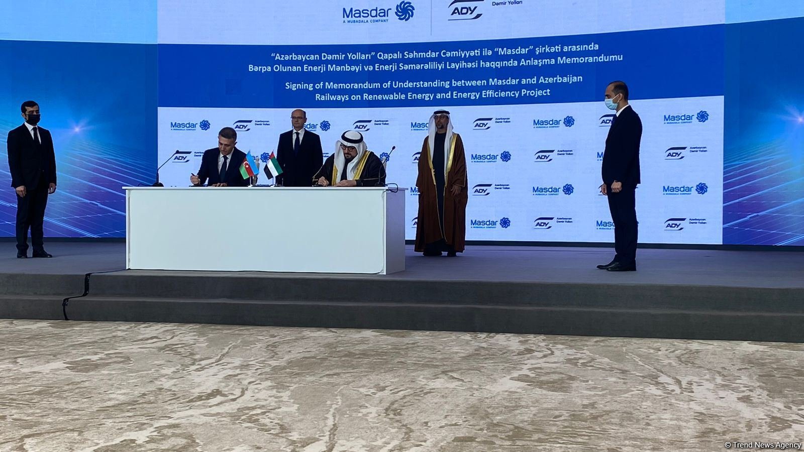 Кроме того, подписан меморандум о взаимопонимании в области возобновляемых источников энергии и энергоэффективности. Свои подписи под меморандумом поставили заместитель председателя ЗАО «Азербайджанские железные дороги» Хиджран Валехов и председатель правления Masdar Мохаммад Джамиль Аль Рамахи.