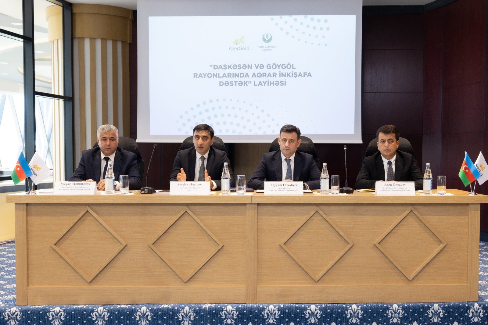 Cостоялась презентация проекта с участием члена правления – заместителя председателя ЗАО "AzerGold" Хайяма Фарзалиева, председателя Агентства аграрных услуг Сардара Гаджиева, заместителя главы Исполнительной власти Дашкесанского района Вугара Мамедова, заместителя главы Исполнительной власти Гейгельского района Арзу Годжаева, а также представителей местных исполнительных органов власти, муниципалитетов и других общественных деятелей.