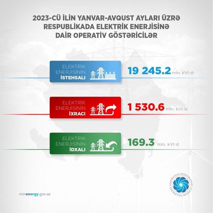 В то же время, как отметил министр, в отчетном периоде 2023 года экспорт электроэнергии из Азербайджана составил 1,53 миллиарда киловатт-часов, в то время как импорт составил 169,3 миллиона киловатт-часов.
